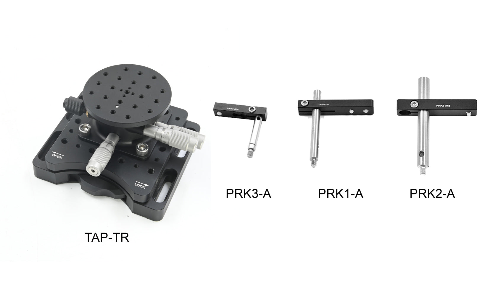 The TAP-TR Tilt and Rotation Stage provides ±4.1° of pitch and tilt adjustment and ±9.5° of rotational adjustment. It is equipped with SM13 micrometer heads to control pitch, tilt, and rotation, with a 10 µm scale division. Each full turn of the micrometer provides: